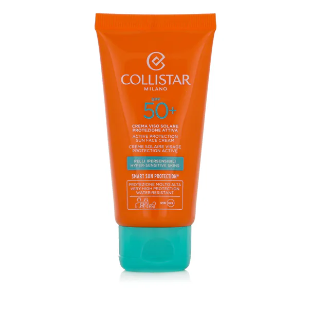 Collistar Smart Sun Protection® Active Protection Sun Face Cream SPF 50+ 50 ml ist eine hochgradig schützende Hautcreme mit LSF 50+, die einen Breitbandschutz gegen UVA/UVB-Strahlen bietet und gleichzeitig die Haut mit Feuchtigkeit versorgt, nährt und vor vorzeitiger Hautalterung schützt. Mit der innovativen Smart Sun Protection® Technologie und Antioxidantien hilft sie, freie Radikale zu neutralisieren und stärkt die Hautbarriere zum Schutz vor Sonnenbrand, Pigmentflecken und Falten.