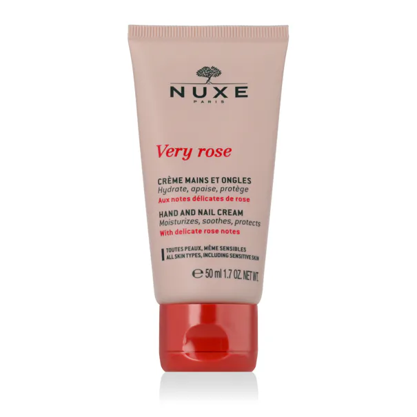 Nuxe Very Rose Hand- und Nagelcreme 50 ml ist eine nährende und weichmachende Hand- und Nagelcreme, die Feuchtigkeit spendet, schützt und die Haut weich und mit dem zarten Duft von Rosen duftend macht. Die Formel mit Rosensamenöl, Kokosnussöl und Vitamin E stärkt die Nägel, beruhigt die Haut und bietet sofortigen Komfort, ohne zu fetten. Ideal für die tägliche Pflege von trockenen und strapazierten Händen.