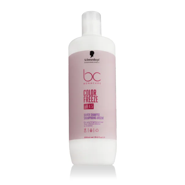 Schwarzkopf Professional BC Bonacure Color Freeze pH 4.5 Silver Shampoo 1000 ml ist ein professionelles Silbershampoo für blondes, gesträhntes und graues Haar, das unerwünschte Gelbstiche neutralisiert und die Haarfarbe schützt. Dank seiner pH-balancierten 4,5 -Technologie hilft es, die Farbpigmente tief in die Haarfaser einzuschließen und die Intensität und Lebendigkeit der Farbe zu verlängern. Die sanfte Formel reinigt Haar und Kopfhaut schonend, ohne sie auszutrocknen.