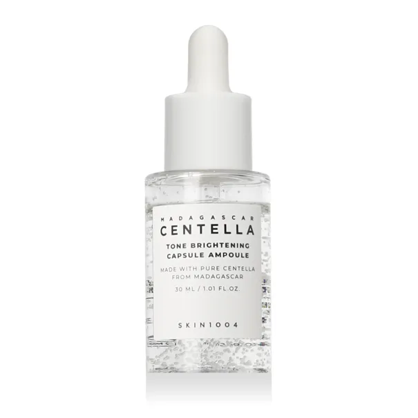 SKIN1004 Madagascar Centella Tone Brightening Capsule Ampoule 30 ml ist eine intensive Serum-Ampulle, die darauf abzielt, den Hautton auszugleichen, aufzuhellen und zu beruhigen. Mit einem hohen Gehalt an Centella Asiatica (Gotu Kola)-Extrakt und anderen aufhellenden Inhaltsstoffen hilft sie, Pigmentunregelmäßigkeiten zu reduzieren und die Haut frisch, einheitlich und mit einem natürlichen Glanz zu hinterlassen.